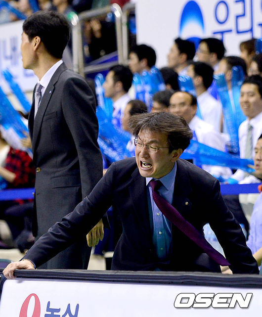 3쿼터, 신한은행 임달식 감독이 선수들의 플레이를 지켜보벼 아쉬움의 제스처를 취하고 있다.