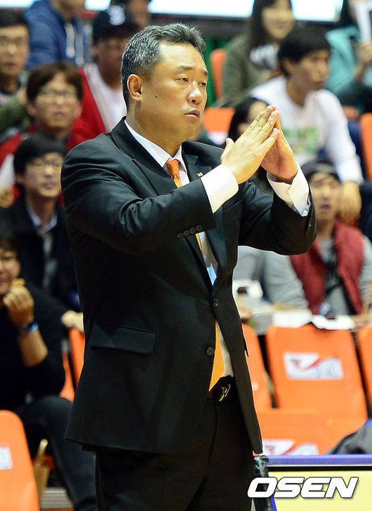 1쿼터, 경기를 지켜보던 KT 전창진 감독이 선수들에게 작전을 지시하고 있다.