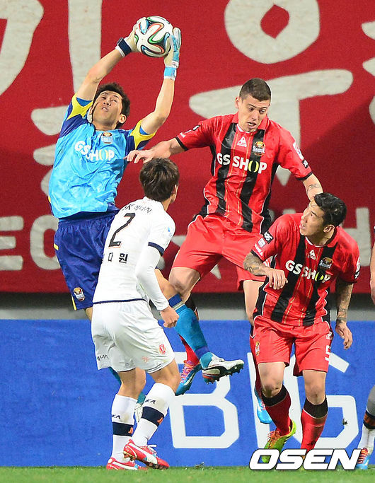 26일 오후 서울 월드컵경기장에서 열린 '현대오일뱅크 K리그 클래식 2014' FC 서울과 제주 유나이티드의 경기 전반, 김용대가 코너킥 볼을 잡고 있다.