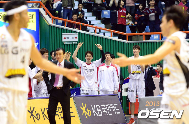 4쿼터, 승리를 확신한 LG선수들이 미소짓고 있다. /ouxou@osen.co.kr