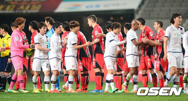 26일 오후 서울 월드컵경기장에서 열린 '현대오일뱅크 K리그 클래식 2014' FC 서울과 제주 유나이티드의 경기 종료 후 제주와 서울 선수들이 인사를 나누고 있다.