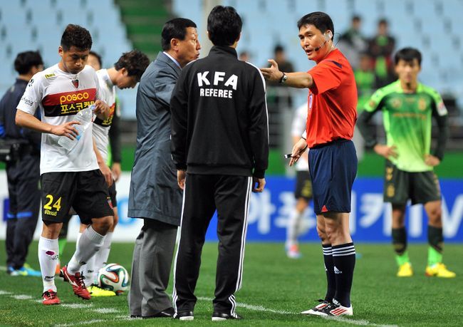 최강희 감독이 분노한 가장 큰 이유 중 하나는 홈에서 심판 판정의 불리함을 겪었다는 점이다. 전북은 전반 5분 신광훈의 핸드볼 파울로 페널티킥을 얻어내 1-0으로 앞서갔다. 하지만 득보다 실이 컸다. 최 감독은 "결정적으로 페널티킥이 독이 됐다"면서 "그 이후로 계속 파울을 안 불어주고 분위기가 이상하게 갔다. 터치아웃 판정도 잘못 내렸다. 제대로 된 카이오의 헤딩도 경고를 주었다"며 일목요연하게 설명했다.