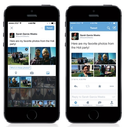 이번 업데이트를 통해, 트위터에 사진을 한 번에 사진을 네 장까지 업데이트 할 수 있다. 하나의 글에 여러 장의 사진을 올리면 4분할 식으로 사진이 모아져 보인다. 현재 이 기능은 모바일을 통해서만 사용할 수 있다.
