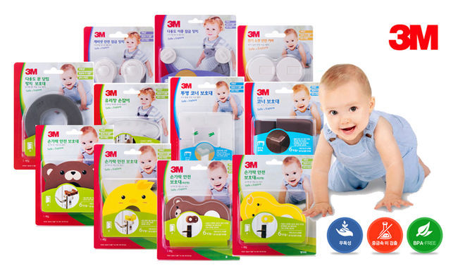 한국쓰리엠 유아안전용품은 집안에서 발생하기 쉬운 아이의 안전사고를 방지하는 제품으로 모서리보호대, 코너보호대, 손가락 안전보호대, 다용도 이중 잠금장치, 캐비닛 안전 잠금장치, 전기소켓 안전커버 등이 있다. 한국쓰리엠은 이들 제품에 유해물질이 없는 3무(무독성, 무증금속, BPA프리) 원칙을 적용해 유아안전용품으로 만들어 냈다.