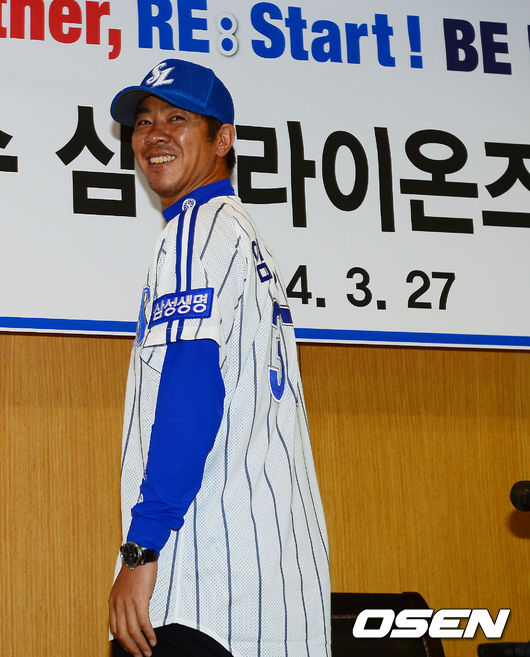 27일 오전 경상북도 경산시 경산볼파크 대강당서 열린 임창용 선수 삼성라이온즈 복귀 기자회견, 임창용이 돌아서며 미소짓고 있다.