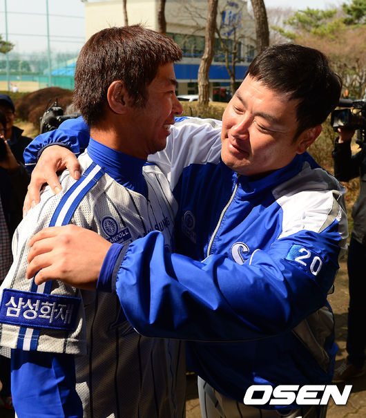 27일 오전 경상북도 경산시 경산볼파크 대강당서 열린 임창용 선수 삼성라이온즈 복귀 기자회견, 기자회견 후 임창용과 진갑용이 포옹을 하고 있다.