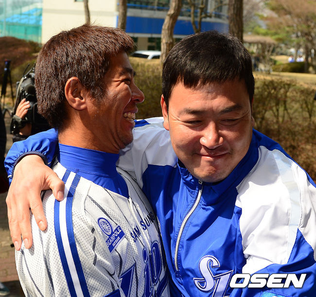 27일 오전 경상북도 경산시 경산볼파크 대강당서 열린 임창용 선수 삼성라이온즈 복귀 기자회견, 기자회견 후 밖에서 진갑용과 임창용이 포옹을 하고 있다.