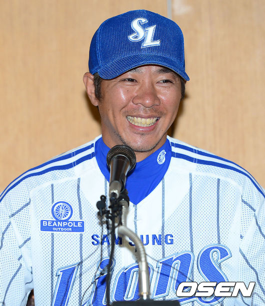 27일 오전 경상북도 경산시 경산볼파크 대강당서 열린 임창용 선수 삼성라이온즈 복귀 기자회견, 임창용이 미소짓고 있다.