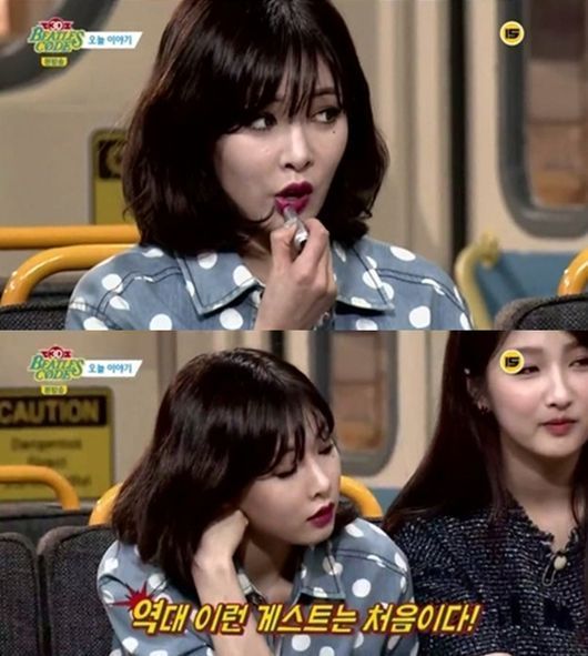 이에 잠시 당황했던 MC 신동엽은 "난 이런 게 좋다. 얼마나 편안해 보이느냐"라고 말하며 웃었고, MC 신동은 현아가 립스틱을 바르는 과정을 따라해 웃음을 자아냈다.