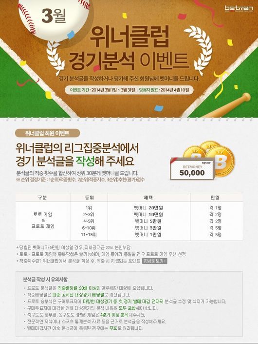 이번 이벤트는 위너클럽 회원 중 '리그집중분석'에서 토토 및 프로토 대상경기 적중 분석글을 작성한 회원 중 경기 분석글을 많이 작성한 회원 중 상위 30명에게 벳머니를 증정한다.