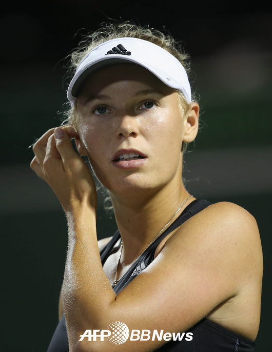 [OSEN=사진팀] 26일(현지시간) 미국 미국 플로리다주 키 비스케인에서 열린 여자프로테니스(WTA) 투어 소니오픈 단식 경기에서 덴마크의 캐럴라인 보즈니아키가 흐르는 땀을 닦고 있다.