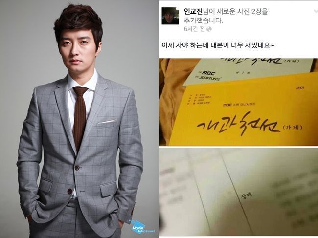 ‘마의’, ‘로맨스가 필요해 2’, ‘구암허준’ 등 다양한 작품에서 사랑을 받아온 인교진은 최근 자신의 페이스북에 ‘개과천선’ 대본 사진과 함께 “이제 자야 하는데 대본이 너무 재밌네요~”라는 멘트를 게재했다. 늦은 새벽임에도 불구하고 캐릭터 탐구에 열중하는 모습으로 드라마에 대한 남다른 포부와 애정을 보여주고 있는 것.