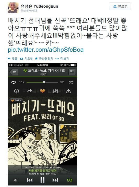 가수 유성은이 선배 가수 배치기의 신곡 ‘뜨래요’(Feat. 앙리 of 3B)를 응원했다.