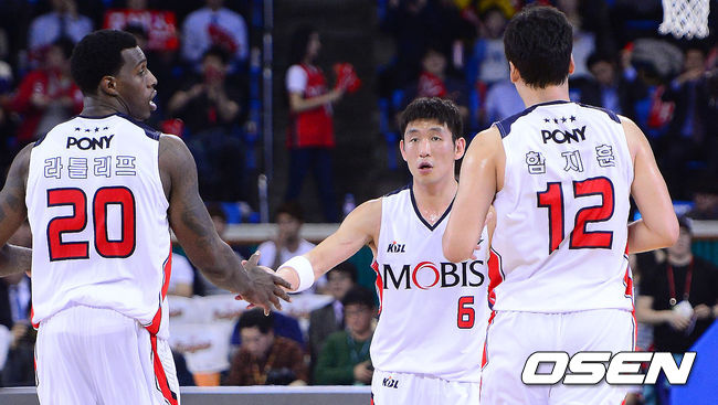1쿼터 모비스 양동근이 라틀리프, 함지훈과 기뻐하고 있다.