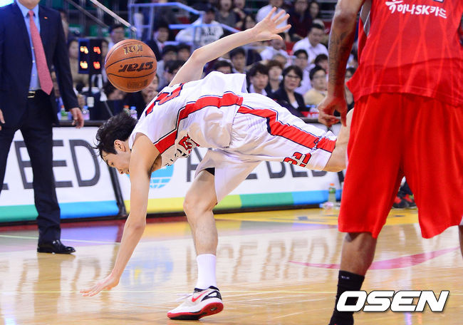 2쿼터 모비스 이지원이 SK 김민수의 다리에 걸려 넘어지고 있다.