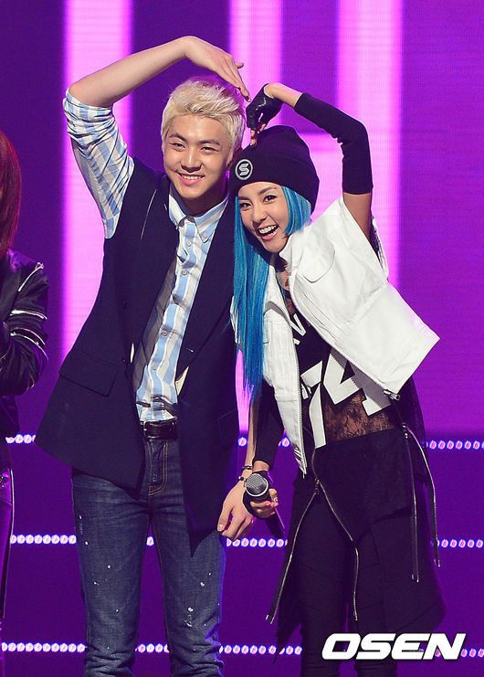 걸그룹 2NE1 산다라와 엠블랙 천둥이 27일 오후 서울 상암동 CJ E&M에서 진행된 Mnet '엠카운트다운'(이하 엠카) 생방송에서 하트 세레모니를 선보이고 있다.