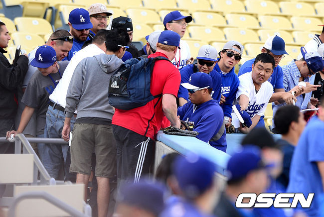경기에 앞서 류현진이 외야에서 캐치볼과 러닝을 마치고 팬들에 사인을 해주고 있다.