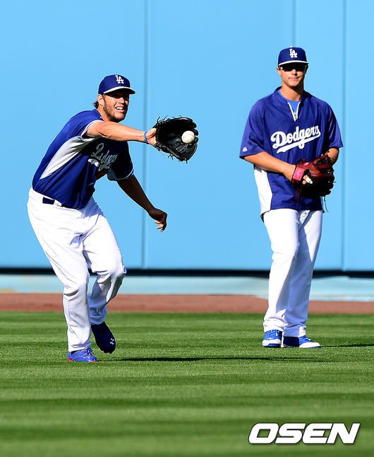 경기에 앞서 다저스 커쇼가 외야에서 연습 타구를 잡고 있다.