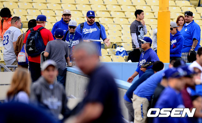 경기에 앞서 류현진이 외야에서 캐치볼과 러닝을 마치고 팬들에 사인을 해주고 있다.