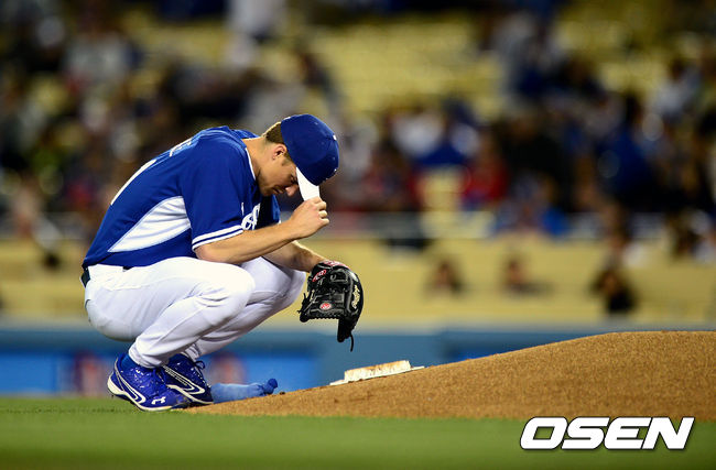 2회초 다저스 그레인키가 마운드에서 생각에 잠겨 있다.