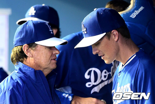 1회초 무실점으로 수비를 마친 다저스 그레인키가 허니컷 코치와 더그아웃에서 이야기를 나누고 있다.
