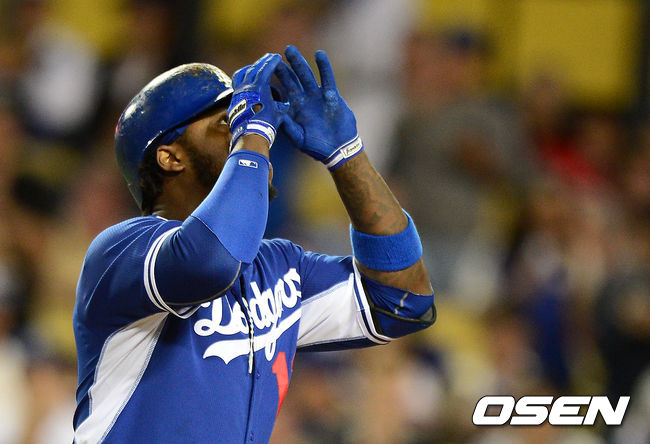 3회말 2사에서 다저스 라미레즈가 솔로포를 날리고 세레모니를 하고 있다.