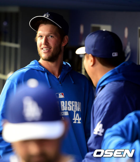 다저스 커쇼와 류현진이 더그아웃에서 이야기를 나누고 있다.