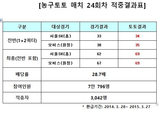 2013-14시즌 남자프로농구 KBL 4강 플레이오프 SK와 모비스의 경기를 대상으로 실시한 농구토토 매치 게임에서 3천명이 넘는 적중자가 나왔다.