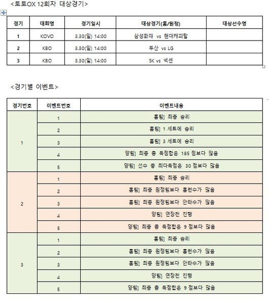 스포츠토토 관계자는 “다양한 이벤트로 토토팬들의 관심을 받고 있는 토토OX게임이 프로배구(KOVO) 챔피언결정전과 프로야구(KBO)를 대상으로 발매한다”며 “토토OX는 승패는 물론 게임에서 나올 수 있는 다양한 상황을 맞혀야 하기 때문에 경기 관전의 재미를 크게 높일 수 있을 것”이라고 밝혔다.