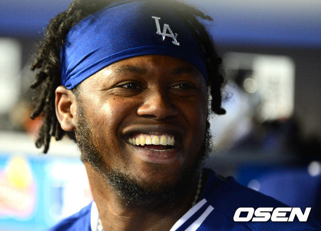 5회말 무사에서 다저스 라미레즈가 연타석 솔로포를 날리고 더그아웃에서 환하게 미소짓고 있다.