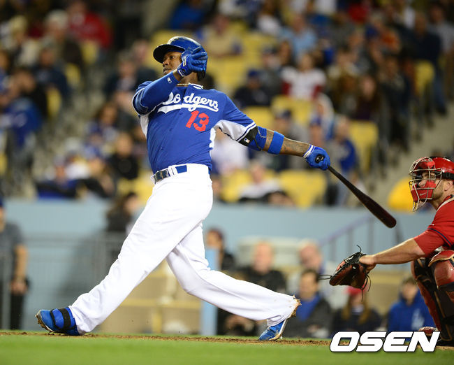 5회말 무사에서 다저스 라미레즈가 연타석 솔로포를 날리며 타구를 바라보고 있다.