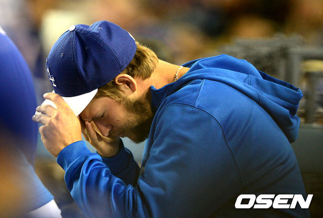 다저스 커쇼가 더그아웃에서 경기를 지켜보며 생각에 잠겨 있다.