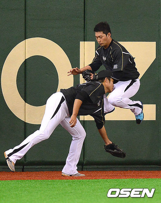 '끝판대장' 오승환이 28일 오후 일본 도쿄돔에서 열리는 '2014 일본프로야구' 개막전 요미우리 자이언츠 대 한신 타이거스의 경기를 앞두고 외야에서 캐치볼로 몸을 풀던 중 날아오는 공을 점프해 피하고 있다.