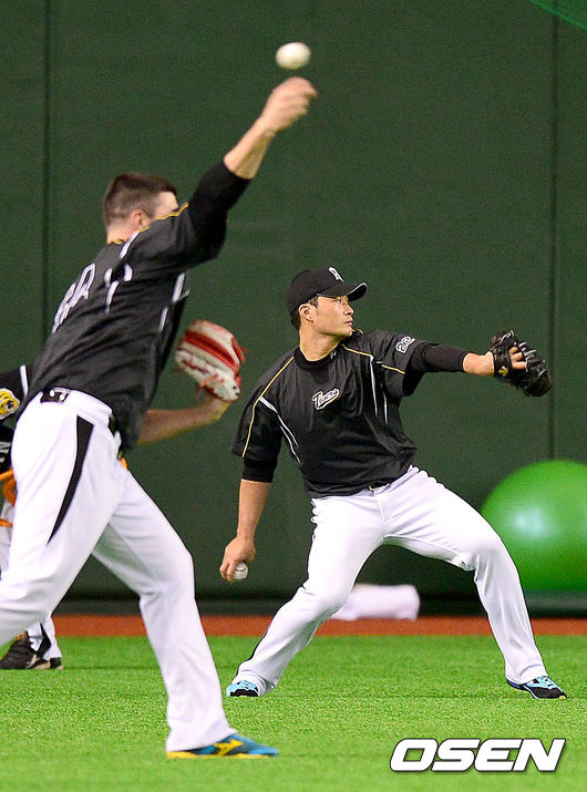 '끝판대장' 오승환이 28일 오후 일본 도쿄돔에서 열리는 '2014 일본프로야구' 개막전 요미우리 자이언츠 대 한신 타이거스의 경기를 앞두고 외야에서 캐치볼로 몸을 풀고 있다.