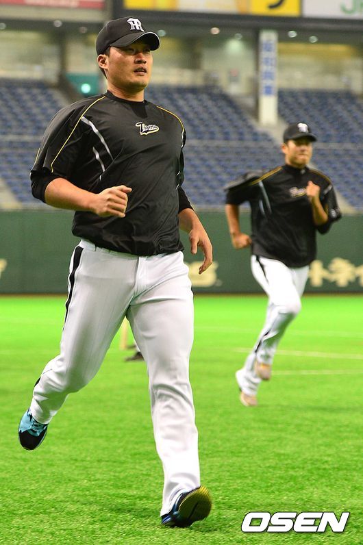 '끝판대장' 오승환이 28일 오후 일본 도쿄돔에서 열리는 '2014 일본프로야구' 개막전 요미우리 자이언츠 대 한신 타이거스의 경기를 앞두고 내야에서 달리기로 몸을 풀고 있다.