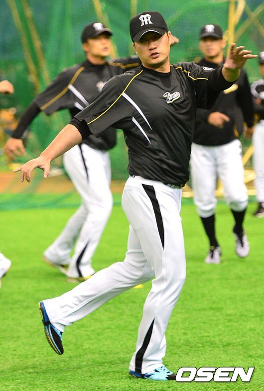 '끝판대장' 오승환이 28일 오후 일본 도쿄돔에서 열리는 '2014 일본프로야구' 개막전 요미우리 자이언츠 대 한신 타이거스의 경기를 앞두고 내야에서 몸을 풀고 있다.