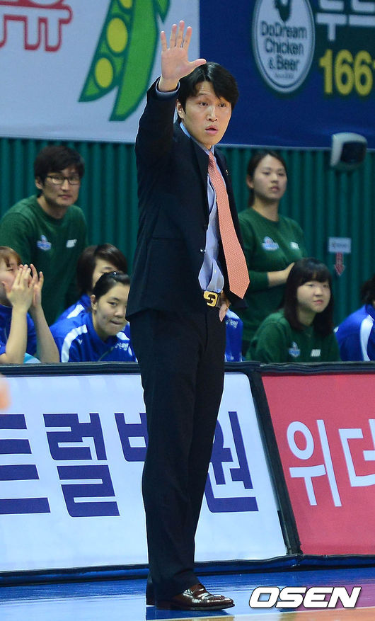28일 오후 안산시 와동체육관에서 열린 '2013-2014 우리은행 여자프로농구' 챔피언결정전 3차전 안산 신한은행과 춘천 우리은행의 경기 1쿼터 우리은행 위성우 감독이 선수들에게 지시를 하고 있다.
