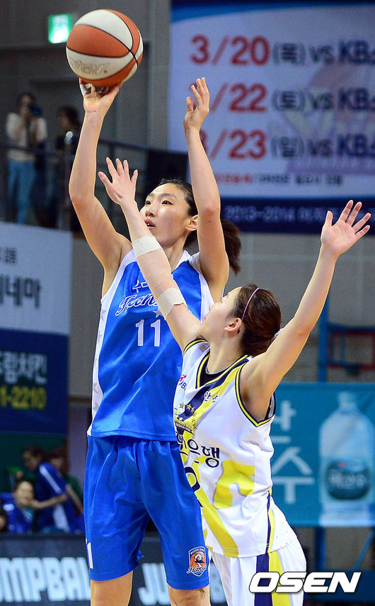 28일 오후 안산시 와동체육관에서 열린 '2013-2014 우리은행 여자프로농구' 챔피언결정전 3차전 안산 신한은행과 춘천 우리은행의 경기 2쿼터 우리은행 임영희가 김규희를 피해 슛을 시도하고 있다.