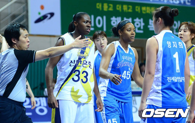 28일 오후 안산시 와동체육관에서 열린 '2013-2014 우리은행 여자프로농구' 챔피언결정전 3차전 안산 신한은행과 춘천 우리은행의 경기 3쿼터 신한은행 스트릭렌과 양지희가 신경전을 펼치고 있다.