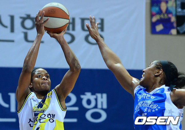 28일 오후 안산시 와동체육관에서 열린 '2013-2014 우리은행 여자프로농구' 챔피언결정전 3차전 안산 신한은행과 춘천 우리은행의 경기 3쿼터 비어드가 퀸을 앞에두고 슛을 시도하고 있다.