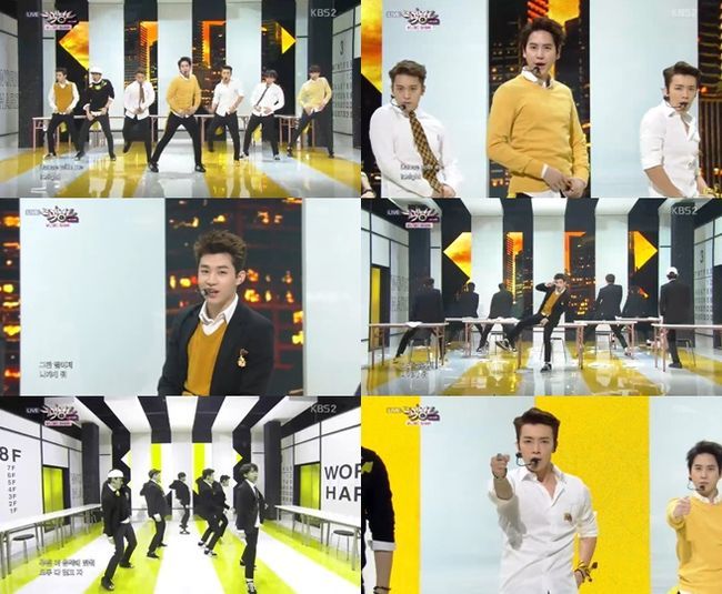 슈퍼주니어M은 28일 방송된 KBS 2TV 음악 프로그램 '뮤직뱅크'에서 신곡 '스윙'의 첫 선을 보였다. 일명 '오피스 퍼포먼스'를 무기로 들고나온 슈퍼주니어M은 책상, 의자를 이용, 일상에 지친 사람들의 모습을 표현했다. 한 편의 뮤지컬을 보는 듯한 화려한 구성의 안무가 인상적.