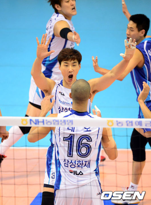28일 오후 대전 충무실내체육관에서 열린 '2013-2014 NH농협 V리그' 삼성화재 블루팡스와 현대캐피탈 스카이워커스의 챔피언결정전 1차전, 1세트 때 공격에 성공한 삼성화재 박철우가 레오와 하이파이브를 하고 있다.