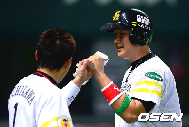 소프트뱅크 이대호가 이닝을 교체로 더그아웃으로 들어오면서 동료와 기뻐하고 있다.