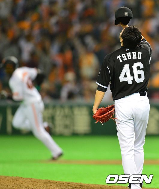6회말 요미우리 공격 2사 주자 없는 상황 로페즈와 앤더슨에게 연거푸 홈런포를 허용한 한신 투수 쓰루 나오토가 모자를 벗으며 아쉬워하고 있다.