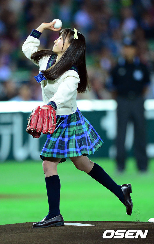 경기에 앞서 일본 아이돌 하시모토 칸나가 시구를 하고 있다.