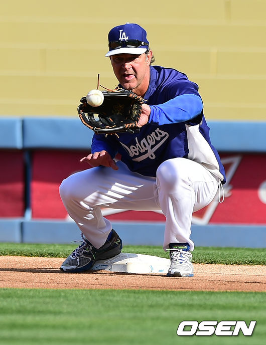 다저스 매팅리 감독이 수비 훈련을 돕고 있다.