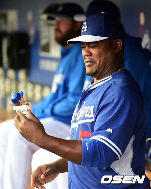 경기에 앞서 유리베가 더그아웃에서 류현진 버블헤드를 바라보며 인상을 쓰고 있다.