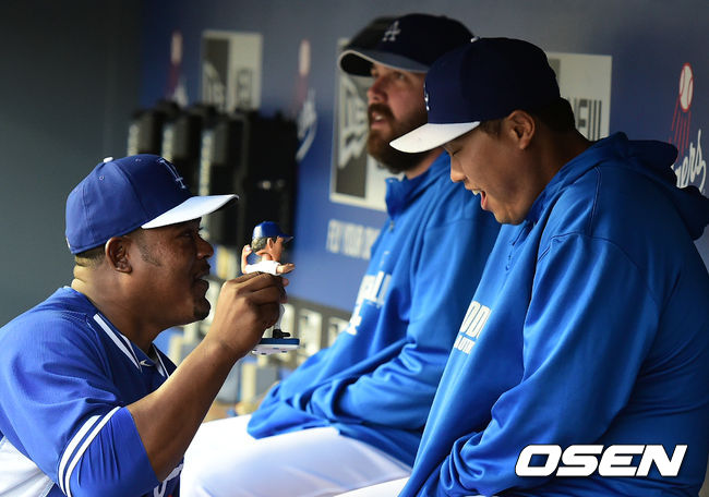 경기에 앞서 유리베가 더그아웃에서 류현진 버블헤드를 손에 들고 류현진과 포즈를 취하고 있다.