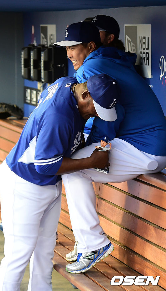 경기에 앞서 유리베가 더그아웃에서 류현진 버블헤드를 손에 들고 류현진과 장난을 치고 있다.