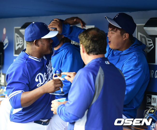 경기에 앞서 유리베가 더그아웃에서 류현진 버블헤드를 손에 들고 류현진과 장난을 치고 있다.